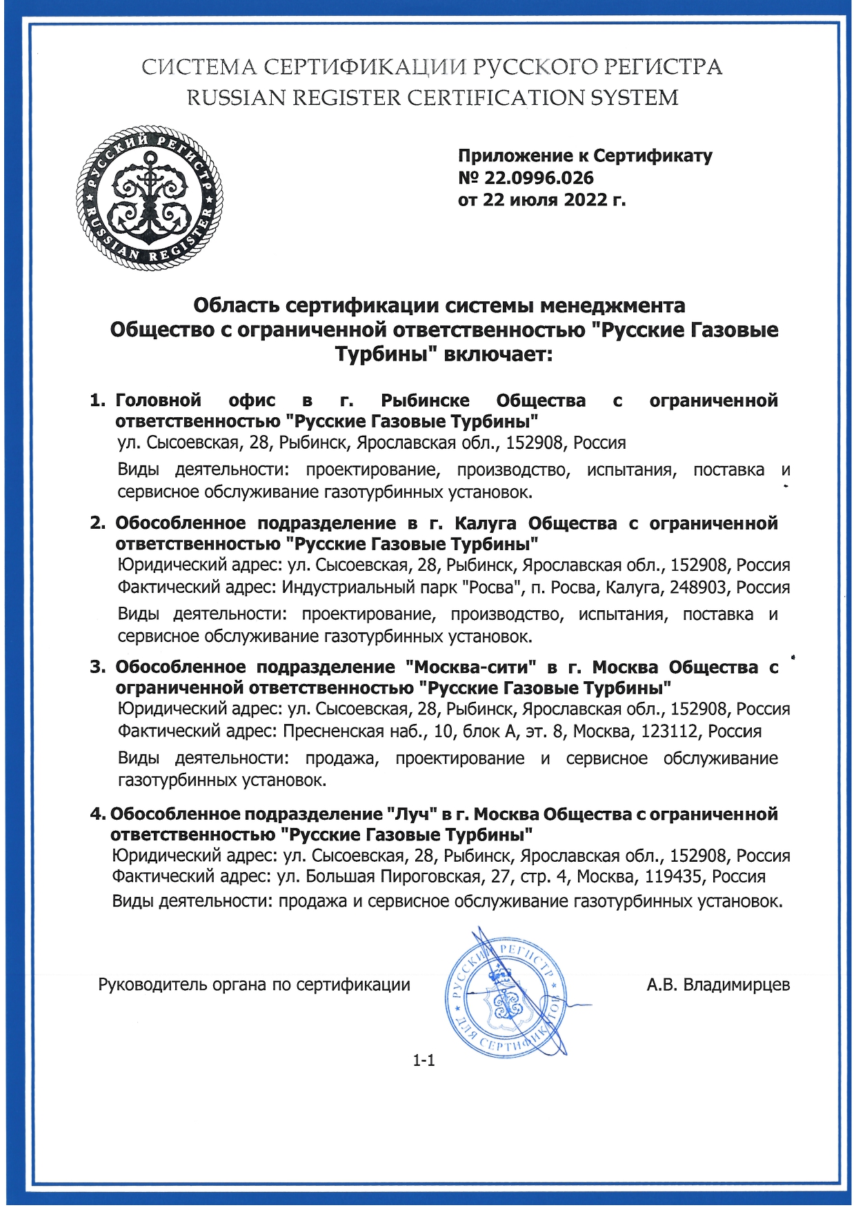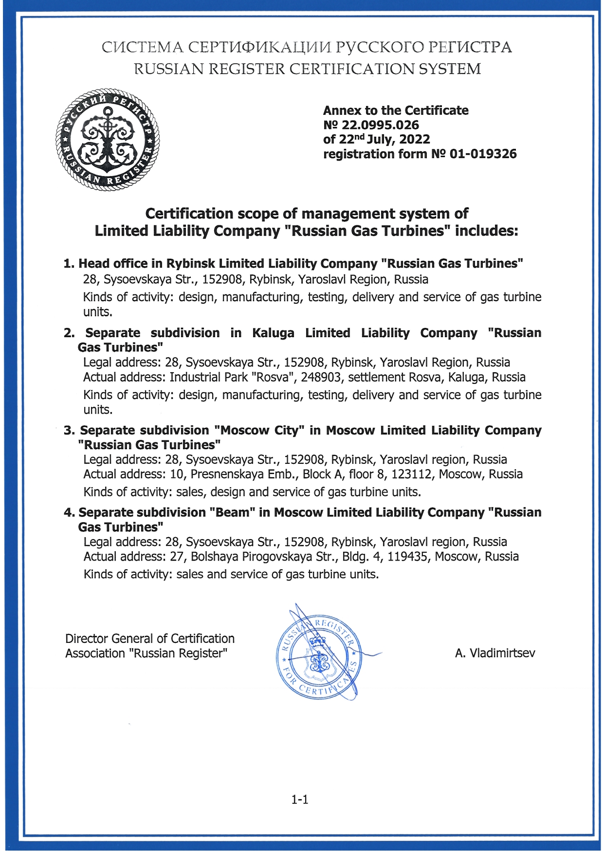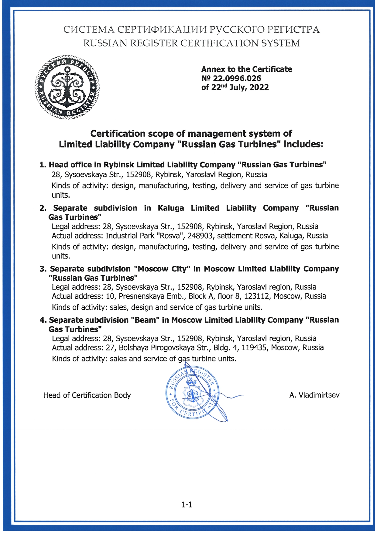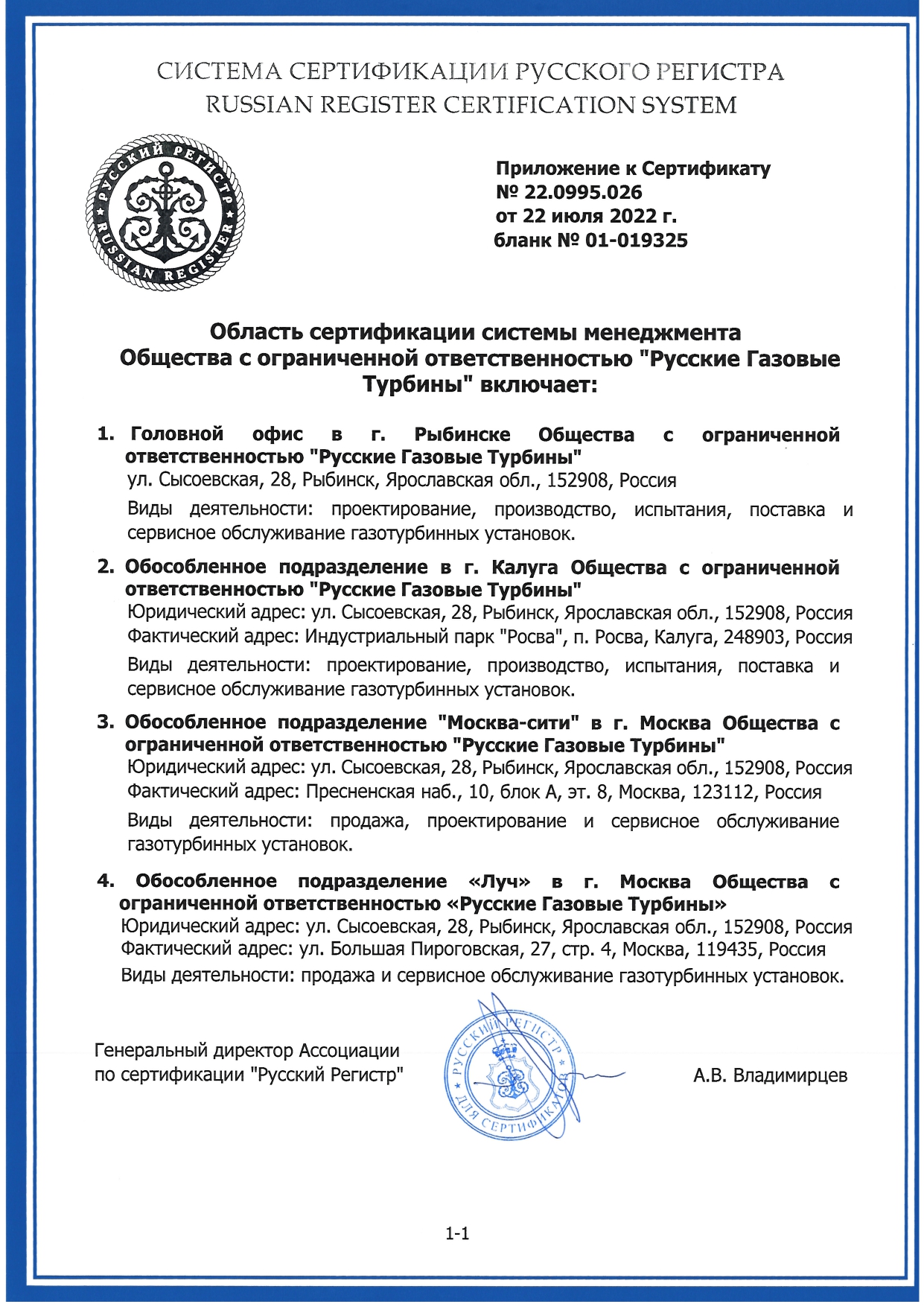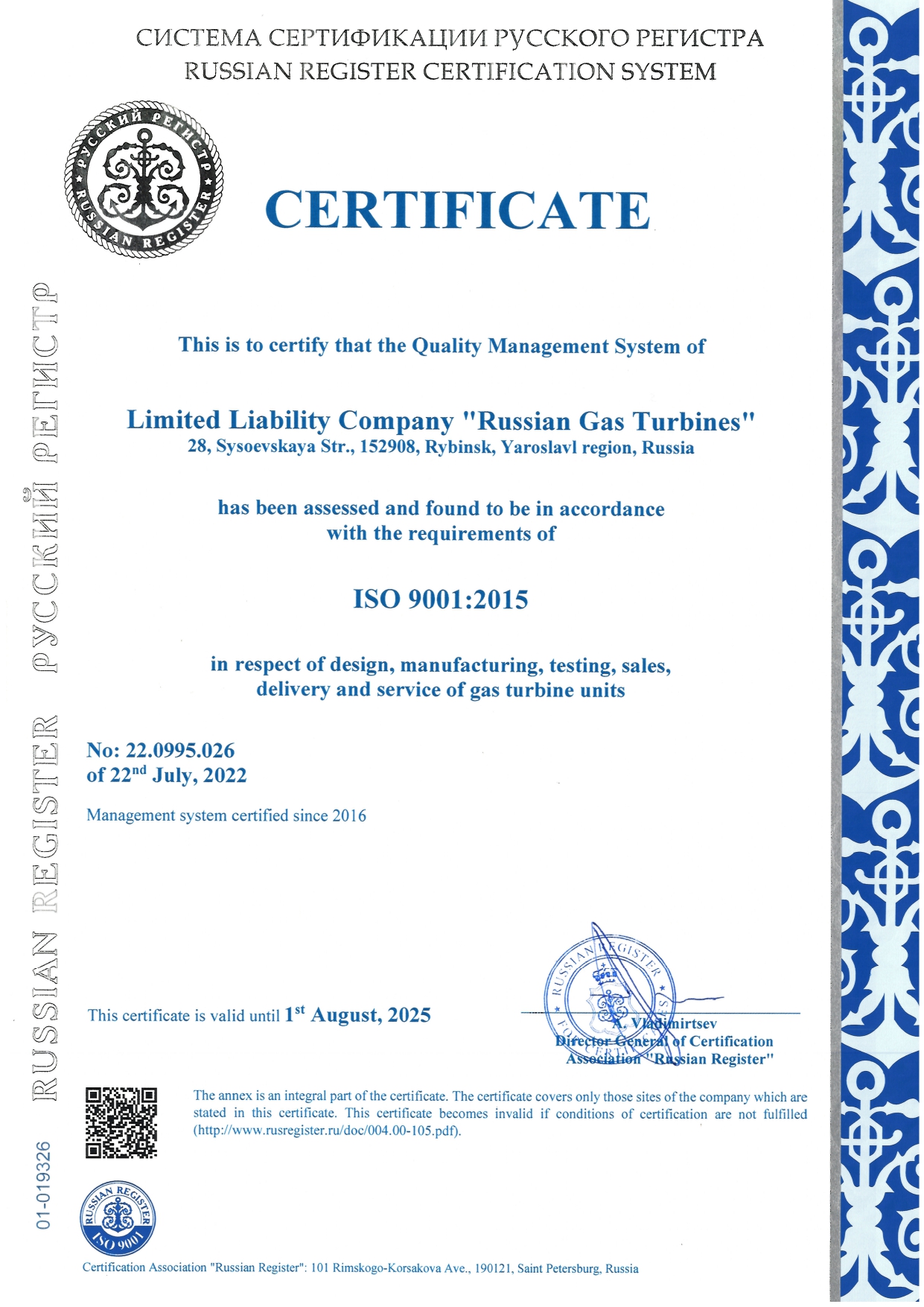 Система менеджмента качества в отношении проектирования, производства, испытания, продажи, поставки и сервисного обслуживания газотурбинных установок соответствует требованиям стандартов: