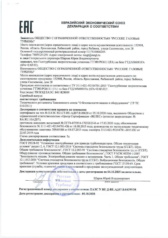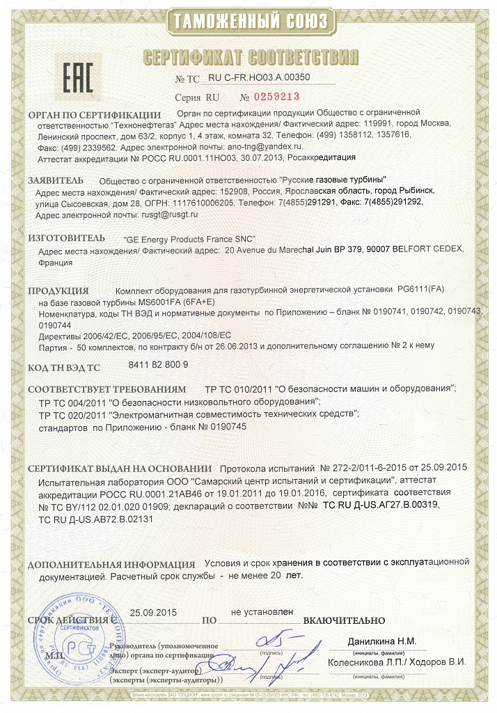 Газотурбинная установка 6F.03 (6FA) сертифицирована согласно требованиям Технических Регламентов Таможенного Союза и получены сертификаты соответствия: